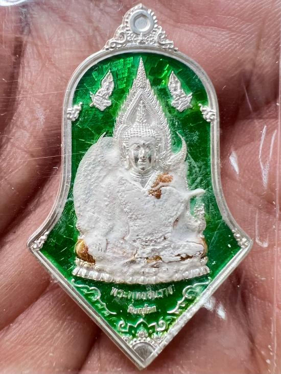 เริ่มเคาะแรก!! เหรียญจำปีสองแคว พระพุทธชินราชหลังท้าวเวสสุวรรณ รุ่น "โชคดี" เนื้อเงินนำฤกษ์ลงยาสีเขียวจีวรเหลือง หมายเลข 88 มหาละรวย (1 ใน 168 องค์) |