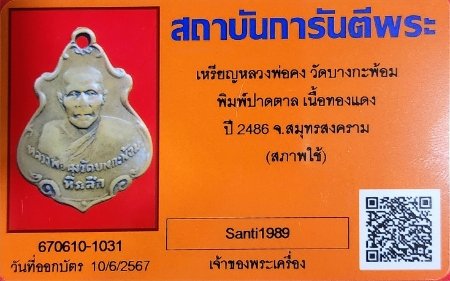 เหรียญปาดตาล หลวงพ่อคง วัดบางกะพ้อม ปี 2486 (นิยม) จ.สมุทรสงคราม พร้อมบัตรรับรอง