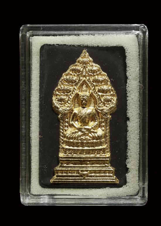 พระนิรันตรายสองกษัตริย์ พระผงพิมพ์สมเด็จหน้าปัดทอง สีดำ ((( หลังฝังโลหะเงินสองกษัตริย์ ชุบทอง+ชุบนาก ))) ไม่ผ่านใช้ กล่องเดิม