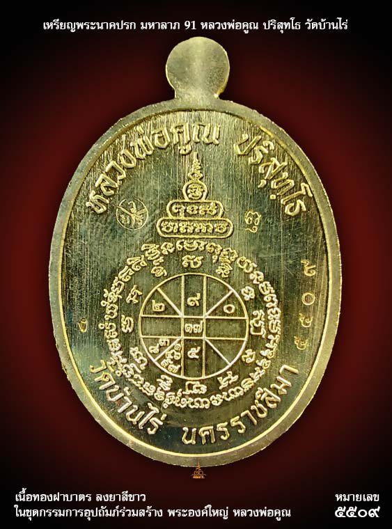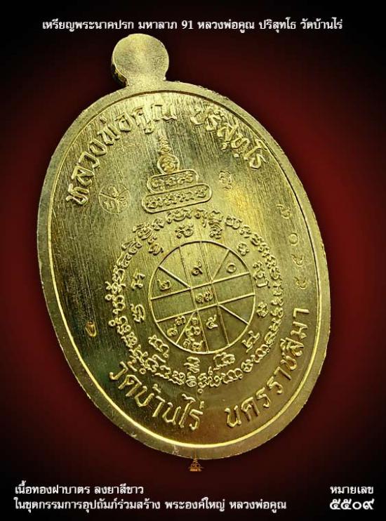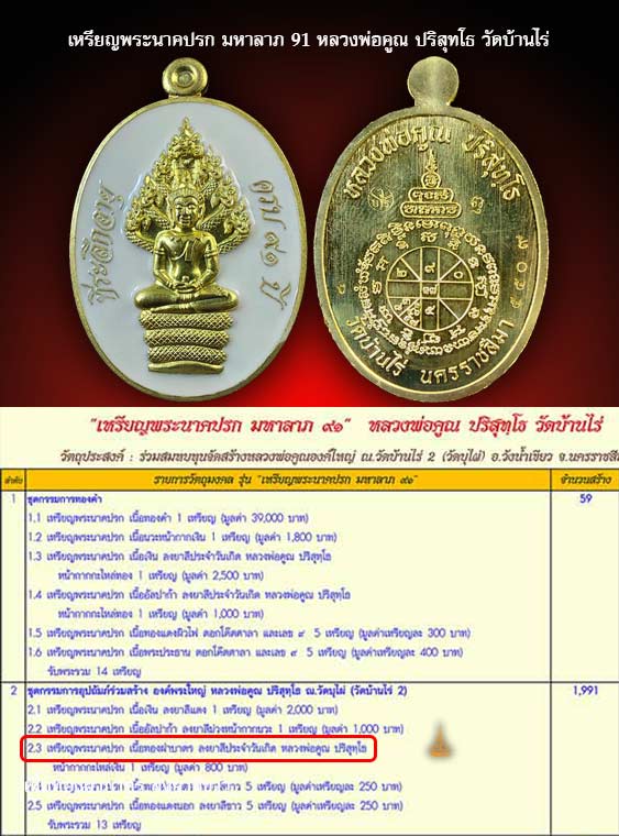 เหรียญพระนาคปรก หลวงพ่อคูณ รุ่นมหาลาภ 91 ปี 2557 เนื้อทองฝาบาตรลงยาสีขาว หมายเลข ๕๕๐๙ ในชุดกรรมการอุปถัมภ์ร่วมสร้าง |
