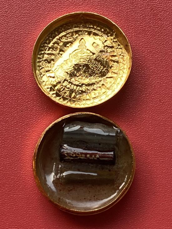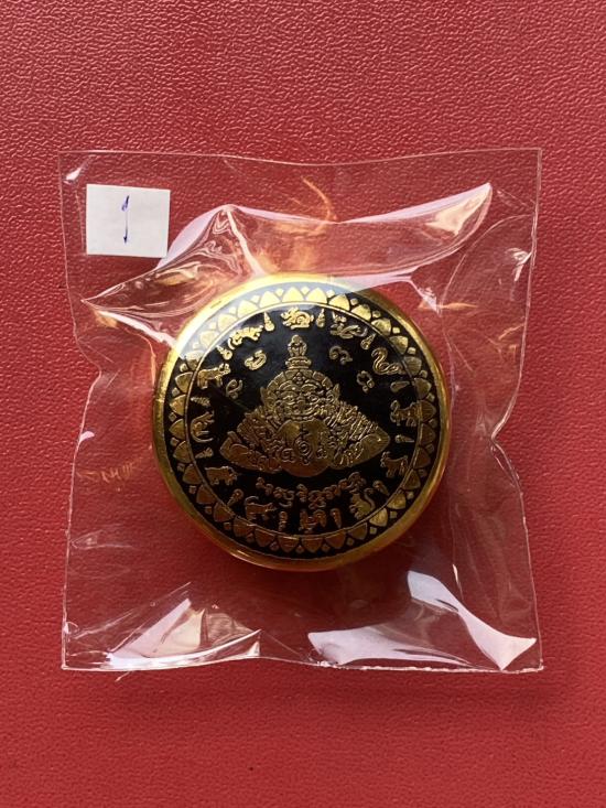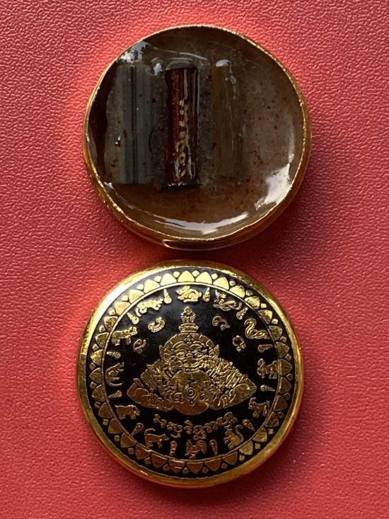 เคาะเดียวแดง สีผึ้งพระราหู รุ่น มงคลจักรวาล เนื้อ โลหะชุบทองลงยาสีดำขอบสีดำ ขนาด3.2ซม |