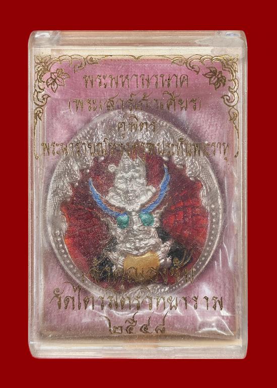รายละเอียด เหรียญพระนารายณ์ทรงครุฑ ประทับยืนบนพระราหู ท่านเจ้าคุณธงชัย วัดไตรมิตรฯ ปี 2548 เนื้อเงินลงยาสีแดง สภาพสวยกล่องเดิมๆ