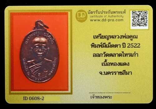 เหรียญหลวงพ่อคูณ ตลาดไทรเก่า สภาพสวย บล๊อกมีเม็ดตา ปี 2522 พร้อมบัตร