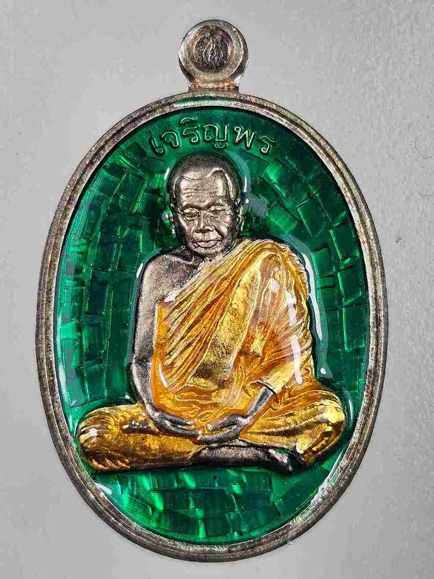 เหรียญหลวงปู่บุญ วัดปอแดง แห่งสวนนิพพาน โคราช ปี2554 รุ่นเจร ิญพร เนื้อกะไหล่เงินลงยาเขียวจีวรเหลือง |