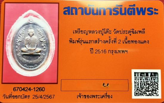 เหรียญหลวงปู่โต๊ะ วัดประดู่ฉิมพลี พิมพ์รุ่นแรกสร้างครั้งที่ 2 เนื้อทองแดง (เนื้อทองแดงรมดำ สร้างแค่ 3,000 เหรียญ) ปี 2516 พร้อมบัตรรับรอง พระหายาก น่าสะสมบูชา