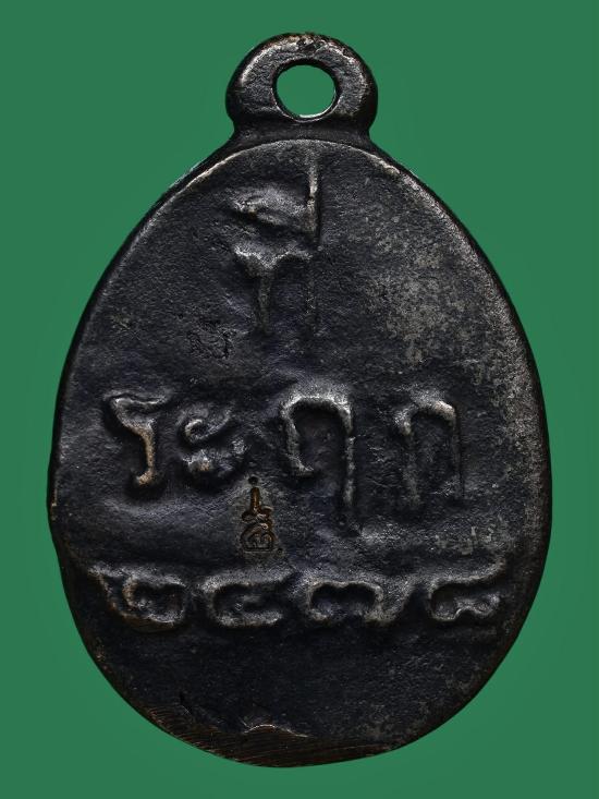 ด้านหน้า เป็นรูปพระสงฆ์ (หลวงพ่อไปล่) อยู่ในกรอบรูปเสมา มีห่วงหล่อในตัวด้านบน