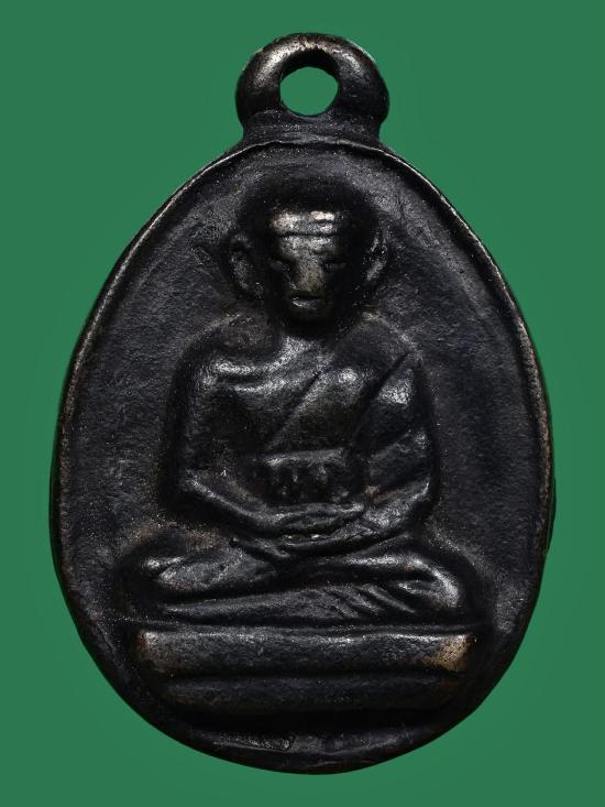 ด้านหน้า เป็นรูปพระสงฆ์ (ไม่มีเกศ) นั่งขัดสมาธิราบบนฐานชั้นเดียว รูปเหรียญเป็นเหรียญหล่อทรงจอบ มีเส้นโค้งนูนโดยรอบเหรียญ 2 เส้น ให้รายละเอียดบนใบหน้า เช่น หู ตา จมูก ปาก ชัดพอประมาณ ครองจีวรเห็นรัดประคดชัดเจน ด้านบนเหรียญมีหูหล่อในตัวซึ่งทำทีละอัน ขนาดจึงไม่เท่ากัน