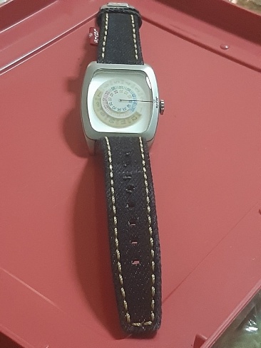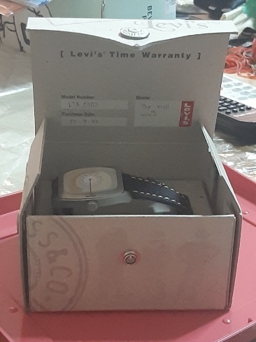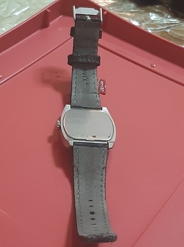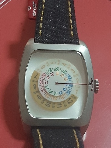 นาฬิกาข้อมือ แบรนด์ "ลีวายส์" (Levi's) ดีไซน์พิเศษ ที่มีหน้าปัดแบบดิสหมุนและสายยีนส์ สถาพใหม่ไม่เคยใช้พร้อมกล่องเดิมๆ สภาพสวยมากๆ การเดินได้ดีปดกติ (เคาะเดียว)