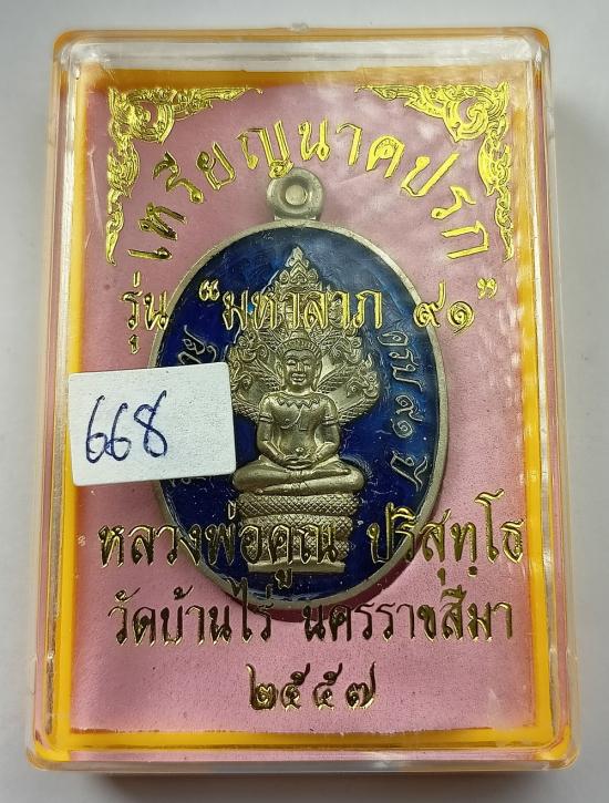 เหรียญนาคปรก หลวงพ่อคูณ มหาลาภ91 เนื้ออาปาก้าลงยาสีน้ำเงิน เบอร์ 668 พร้อมกล่องครับ