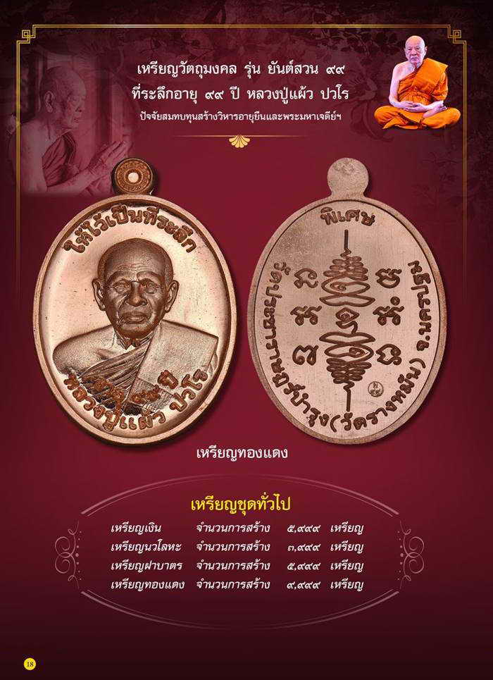 เหรียญยันต์สวน 99 หลวงปู่แผ้ว ปวโร วัดรางหมัน ที่ระลึกอายุ 99 ปี เนื้อทองแดง ตอกโค๊ดกำกับ พร้อมกล่อง รับประกันพระแท้ตามกติกา |