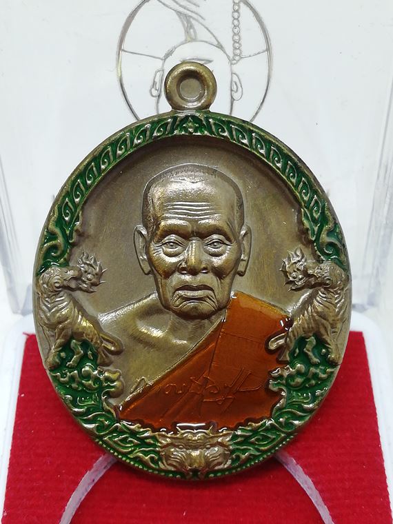เหรียญ รุ่น ราชาพยัคฆ์ (เสือ2) หลวงพ่อพัฒน์ วัดห้วยด้วน จ.นครสวรรค์ เนื้อมหาชนวน ลงยา 2 สี (ขอบเขียว,ลงยาจีวร) หมายเลข 79553