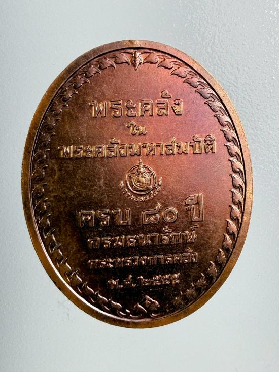 เหรียญพระคลังมหาสมบัติ หรือเหรียญเพชรยอดมงกฎุ ปี 2556 ด้านหน้าเป็นรูปพระคลังมหาสมบัติ เทวดาผู้ปกปักรักษาทรัพย์สินของประเทศในกรมพระคลังหลวงมาตั้งแต่สมัยรัชกาลที่ ๕ ซึ่งถือเป็นเทพทางด้านเศรษฐกิจและการเงินของประเทศ และด้านหลังเป็นรูปยันต์เกราะเพชร ซึ่งเป็นสิ่งศักดิ์สิทธิ์ที่ปกปักรักษาภยันตรายไม่ให้กล้ำกรายต่อผู้ครอบครอง