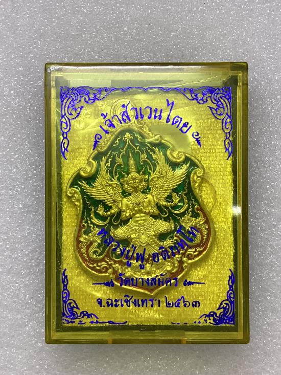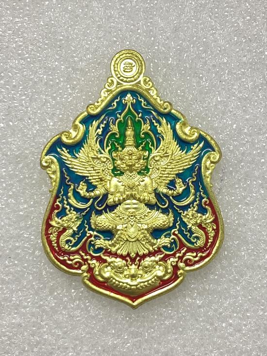 เหรียญพญาครุฑ รุ่น เจ้าสัวเวนไตย หลวงปู่ฟู อติภทฺโท วัดบางสมัคร จ.ฉะเชิงเทรา เนื้อทองทิพย์ ลงยาสี เขียว -แดง-ฟ้า กล่องเดิม |