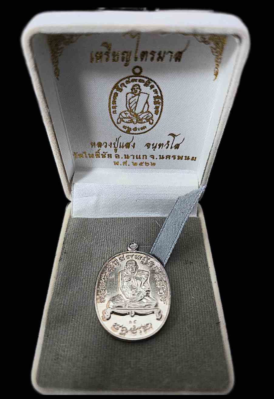 เหรียญไตรมาส เนื้อเงิน เลข 35 พร้อมกล่องเดิม หลวงปู่แสง วัดโพธิ์ชัย นครพนม ปี 2562 รับประกันพระแท้ตลอดชีพ