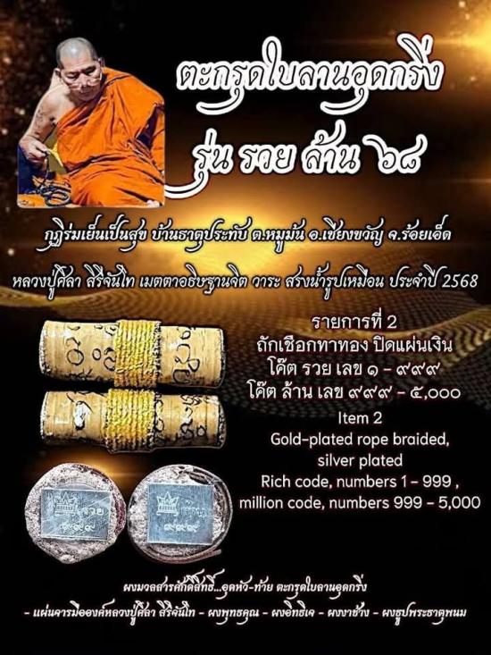 หลวงปู่ศิลา รุ่นรวยล้าน68 ตะกรุดใบลานอุดกริ่ง ถักเชือกทาทอง ปิดแผ่นเงิน ซีลเดิมลุ้นเลขสวย