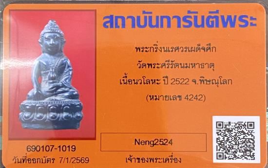 Rare items เลขคู่เลขสวย พระกริ่งนเรศวรเผด็จศึก วัดพระศรีรัตนมหาธาตุ เนื้อนวะโลหะ หมายเลข 4242 + บัตร g pra ครับ