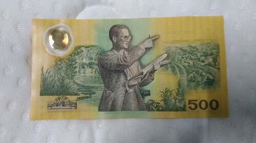 ธนบัตรที่ระลึกเฉลิมพระเกียรติ ฉลองสิริราชสมบัติครบ 50 ปี พระบาทสมเด็จพระปรมินทรมหาภูมิพลอดุลยเดช (ฉบับละ 500 บาท ) ชุดผ้าไหมทอมือ หมายเลข 98783
