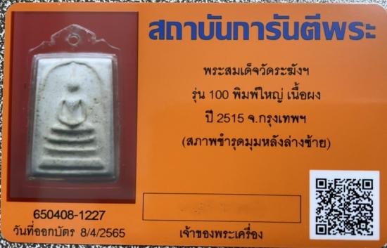พระสมเด็จวัดระฆังฯ รุ่น 100 ปี พิมพ์เส้นด้าย นิยม เนื้อผง ปี2515 กรุงเทพ บัตรรับรอง