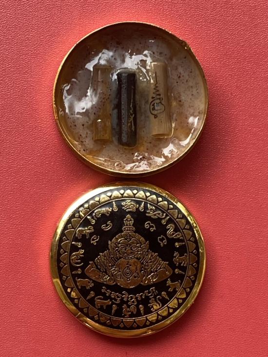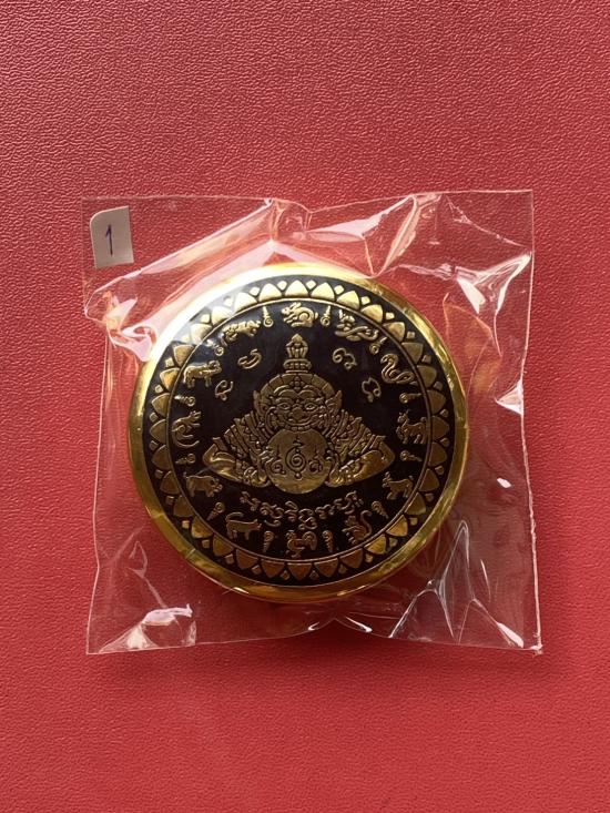 เคาะเดียวแดง สีผึ้งพระราหู รุ่น มงคลจักรวาล เนื้อ โลหะชุบทองลงยาสีดำขอบสีดำ ขนาด 5ซม |