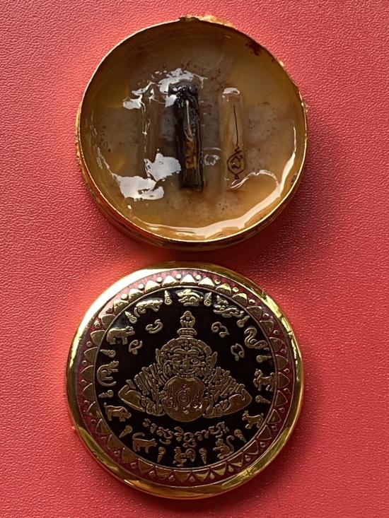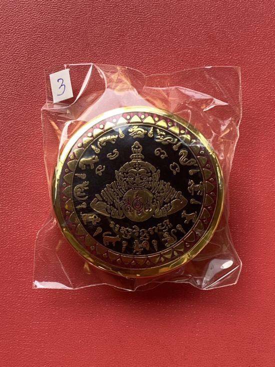 เคาะเดียวแดง สีผึ้งพระราหู รุ่น มงคลจักรวาล เนื้อ โลหะชุบทองลงยาสีดำขอบสีแดง ขนาด 5ซม |