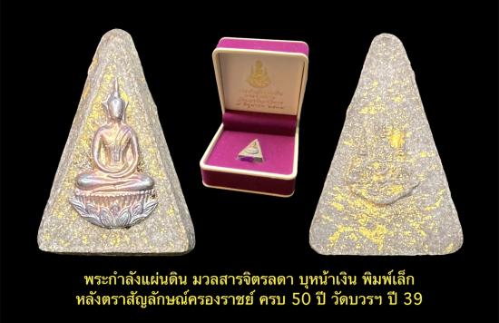 พระกำลังแผ่นดิน มวลสารจิตรลดา บุหน้าเงิน พิมพ์เล็ก หลัง ตราสัญลักษณ์ครองราชย์ ครบ 50 ปี วัดบวรฯ ปี 39 เคาะเดียว