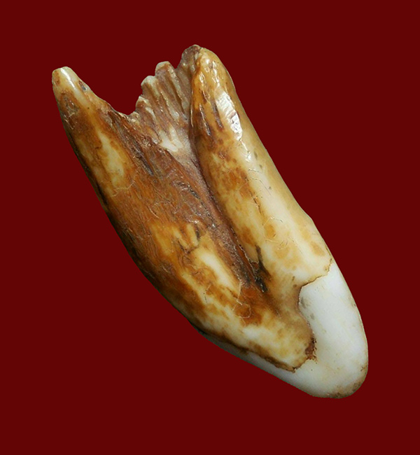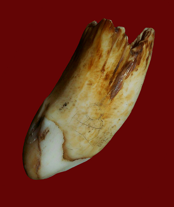 เขี้ยวสัตว์ มีรอยจารรอบเขี้ยว ขนาดประมาณ 4 เซนติเมตร ไม่ทราบที่