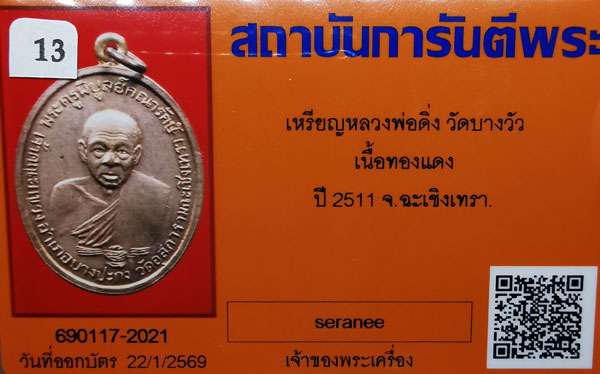 เหรียญหลวงพ่อดิ่ง วัดบางวัว เนื้อทองแดงผิวไฟ ห่วงเดิม ปี2511 จ.ฉะเชิงเทรา + บัตรG-pra สภาพเดิมค่ะ |