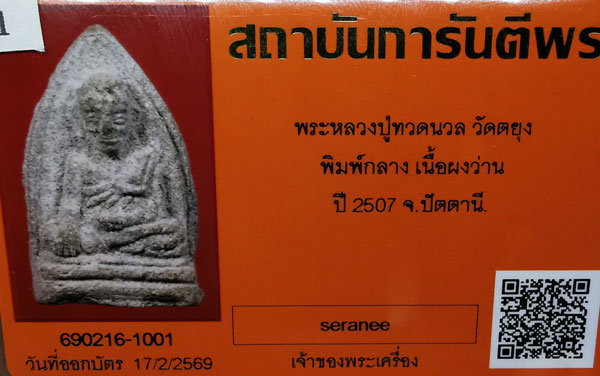 พระหลวงปู่ทวดนวล วัดตุยง พิมพ์กลาง(มีหน้าตานิ้วมือติดชัด) เนื้อผงว่าน ปี 2507 จ.ปัตตานี + บัตร G-pra สภาพสวยเดิมค่ะ |