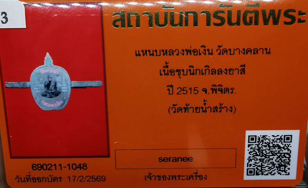 แหนบหลวงพ่อเงิน วัดบางคลาน เนื้อชุบนิกเกิลลงยาสี ปี2515 จ.พิจิตร(วัดท้ายน้ำสร้าง) + บัตรG-pra สภาพเดิมค่ะ สภาพตามรูปทุกประการค่ะ