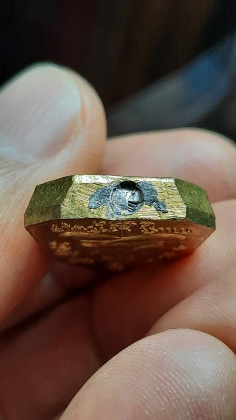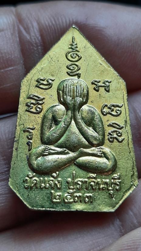 เหรียญปั๊ม หลังพระปิดตา หลวงพ่อเพชร วัดแจ้ง จ.ปราจีนบุรี ปี 2533 (เนื้อทองเหลือง ฐานฝังตะกรุด)