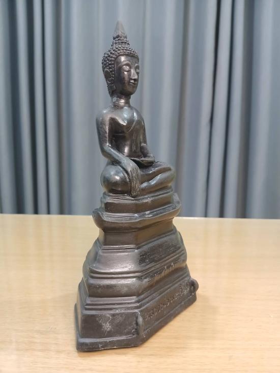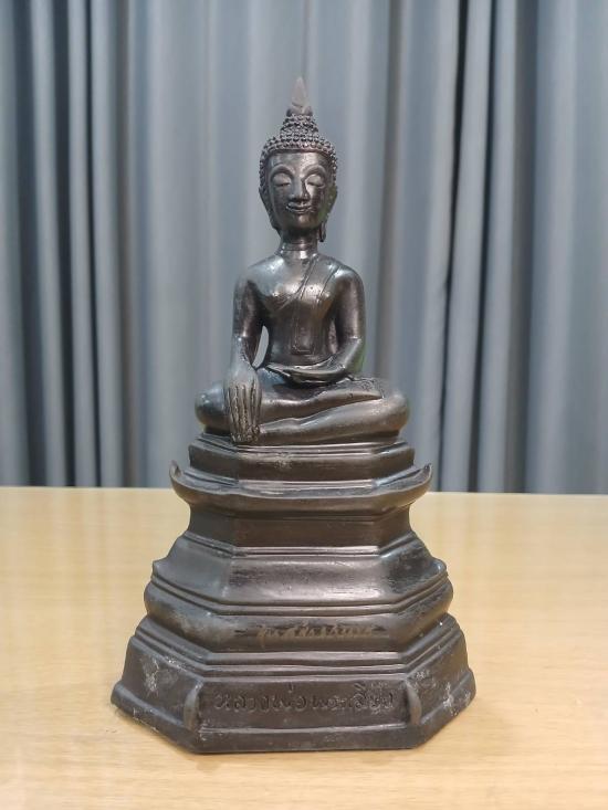 พระบูชาหลวงพ่อพระเสี่ยง วัดมณีโคตร โพนพิสัย หนองคาย รุ่นสร้างวิหาร ปี 2541 หน้าตัก 3 นิ้ว สูง 8.5 นิ้ว ฐานกว้าง 5 นิ้ว เนื้อทองเหลืองรมดำ
