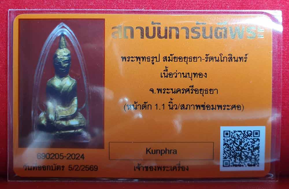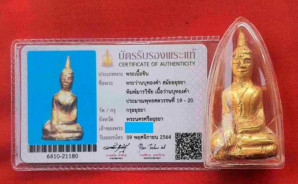 พระเนื้อว่านบุทองคำ สมัยอยุธยา พร้อมบัตรรับรองพระแท้สองสถาบัน เคาะเดียวแดง 9,500 บาท