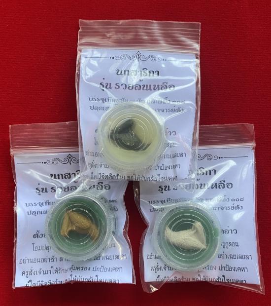นกสาริกา รุ่นรวยล้นเหลือ บรรจุเทียนชัย 9 วัด และสีผึ้ง108 ปลุกเสกโดย 9 พระคณาจารย์ดัง (1กระดาน 3 อัน) |