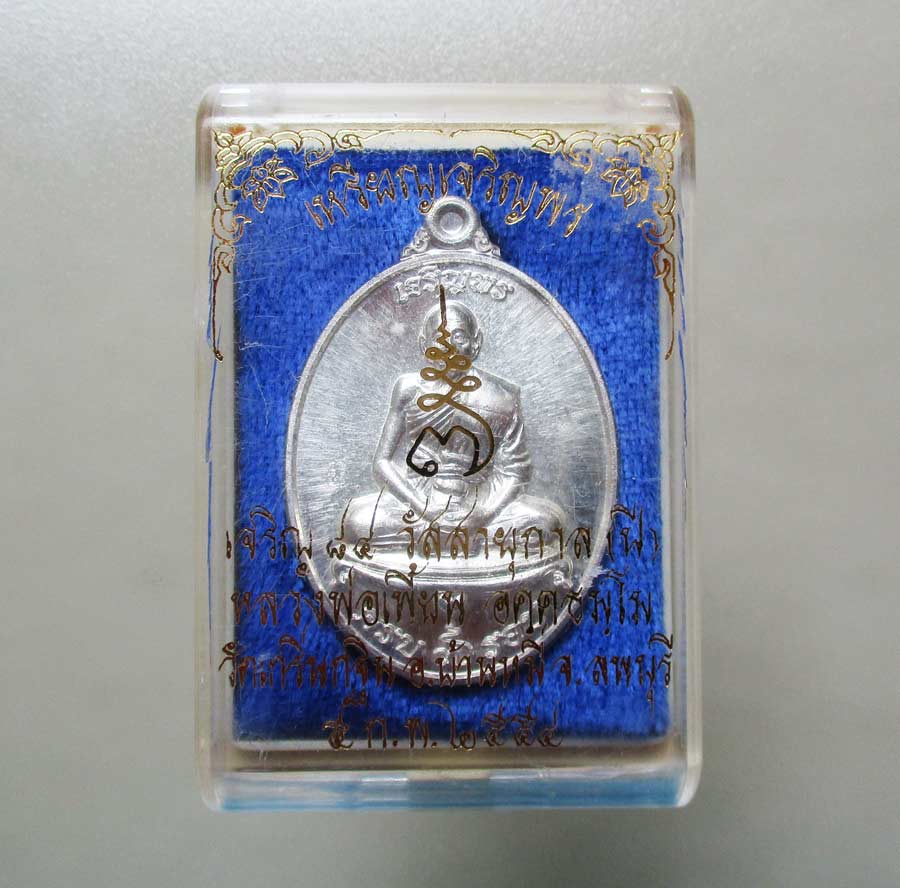 เหรียญเจริญพร 7 รอบ หลวงพ่อเพี้ยน วัดเกริ่นกฐิน จ.ลพบุรี พ.ศ.2554 เนื้อเงินขาว ตอกโค๊ต ยิงเลเซอร์หมายเลข สภาพสวยกริ๊บ พร้อมกล่อง |