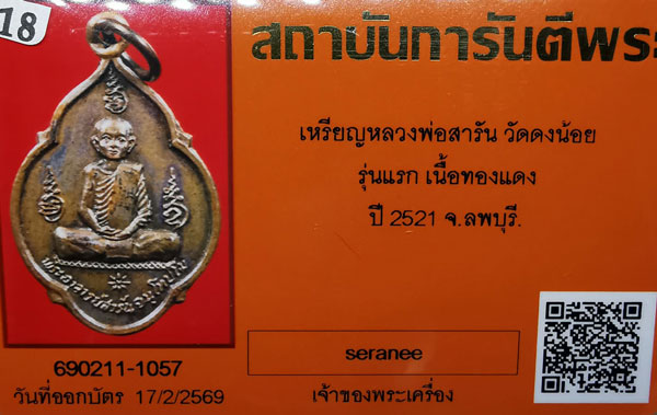 เหรียญหลวงพ่อสารัน วัดดงน้อย รุ่นแรก เนื้อทองแดง ห่วงเดิม ปี2521 จ.ลพบุรี + บัตรG-pra สภาพสวยเดิมค่ะ สภาพตามรูปทุกประการค่ะ