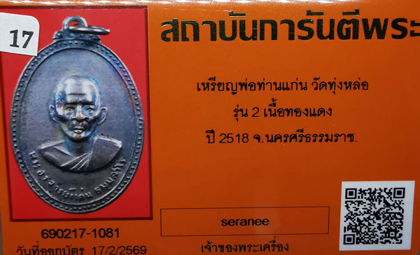 เหรียญพ่อท่านแก่น วัดทุ่งหล่อ รุ่น2 เนื้อทองแดง ห่วงเดิม ปี2518 จ.นครศรีธรรมราช + บัตรG-pra สภาพสวยเดิมค่ะ