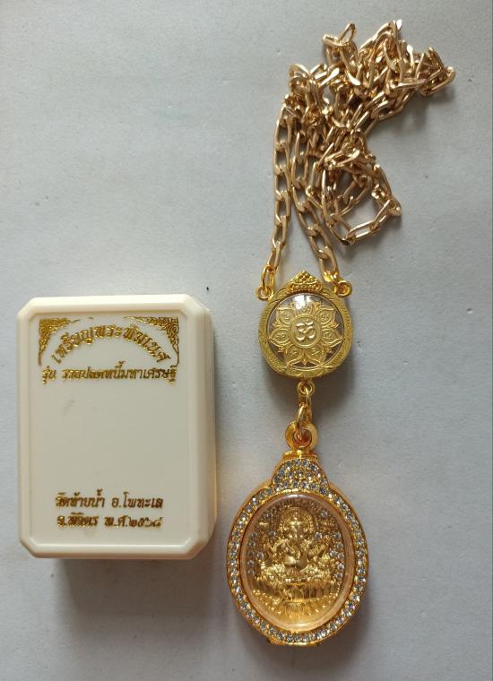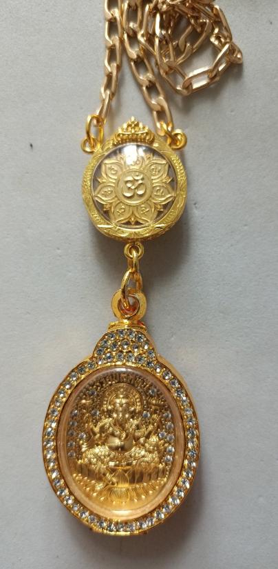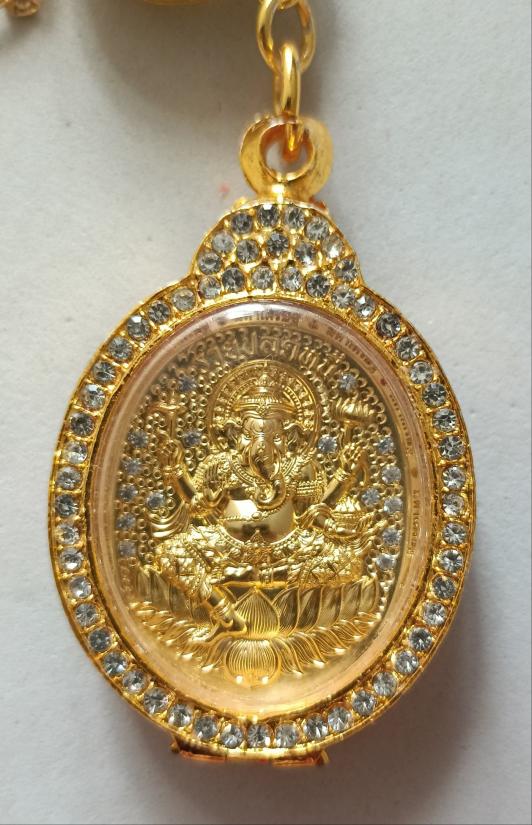 วัดใจเคาะเดียวแดงจ้า เหรียญพระพิฆเนศ เนื้อนวะชุบน้ำทองคำฝังเพชรเต็มพื้น พร้อมชุดสร้อย ออกวัดท้ายน้ำ เคาะเดียวแดงจ้า |