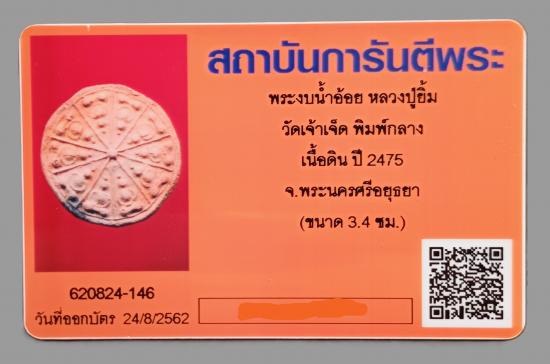 พระงบน้ำอ้อยเนื้อดิน พิมพ์กลาง หลวงปู่ยิ้ม วัดเจ้าเจ็ดใน ปี 2475 จังหวัดอยุธยา สภาพสวยคมชัด + บัตรเดิม