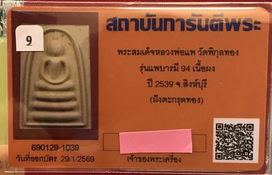 พระสมเด็จหลวงพ่อแพ วัดพิกุลทองเปิดที่ 500 ค่าบัตร รุ่นแพบารมี 94 เนื้อผง ปี 2539 จ.สิงห์บุรี (ฝังตะกรุดทอง) |