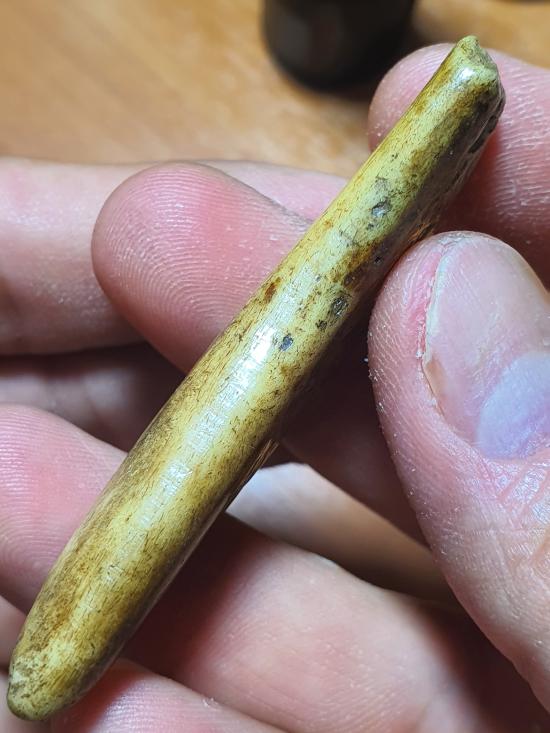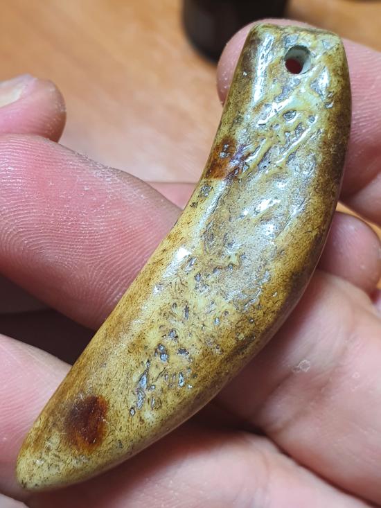 กระดูกเสือแกะเป็นรูปเขี้ยว สำหรับไว้ใช้ของคนสมัยโบราณ ขนาดประมาณ 6 cm