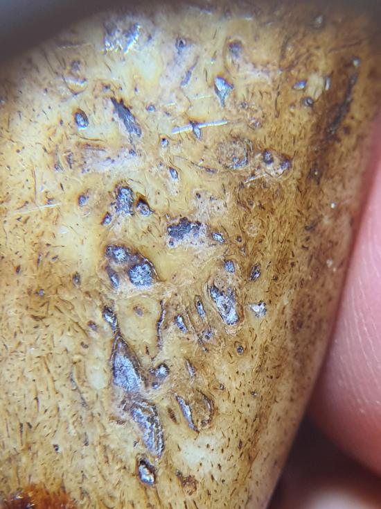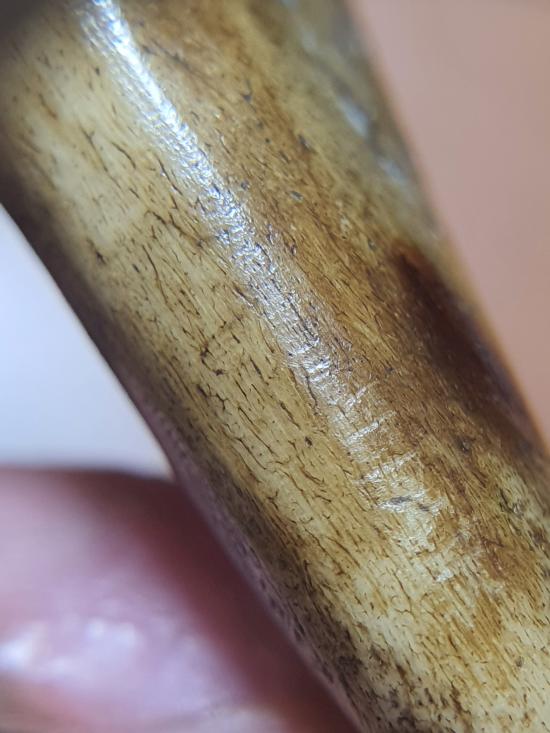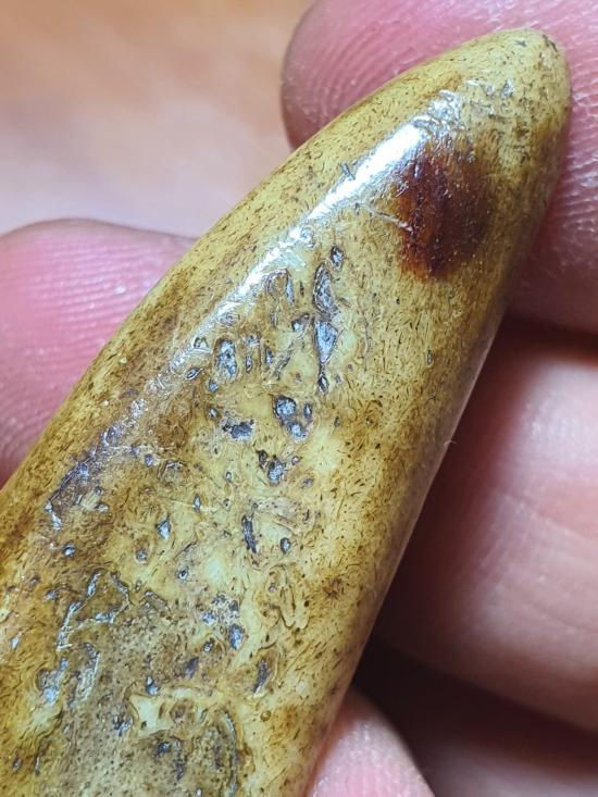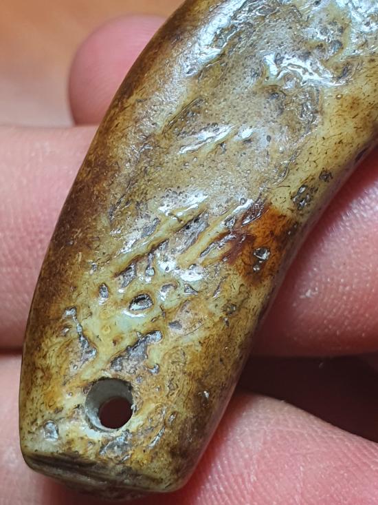กระดูกเสือแกะเป็นรูปเขี้ยว สำหรับไว้ใช้ของคนสมัยโบราณ ขนาดประมาณ 6 cm |