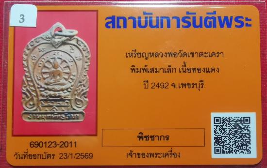 เหรียญเสมาเล็ก ลพ.วัดเขาตะเครา เนื้อทองแดง ปี2492 จ.เพชรบุรี พร้อมบัตรรับรอง |