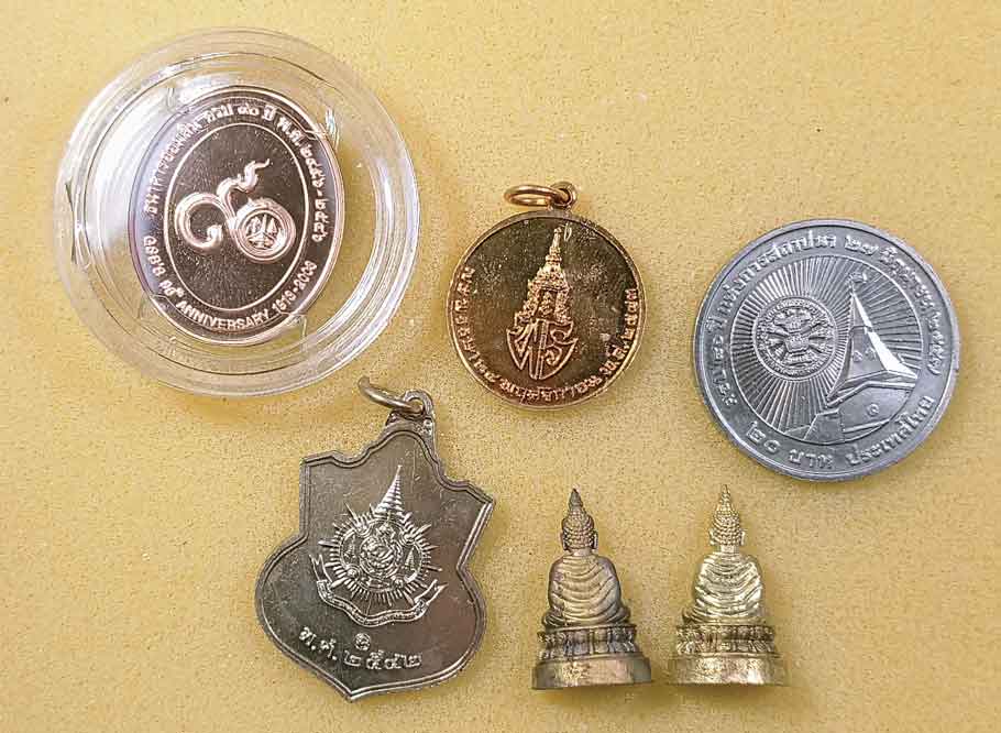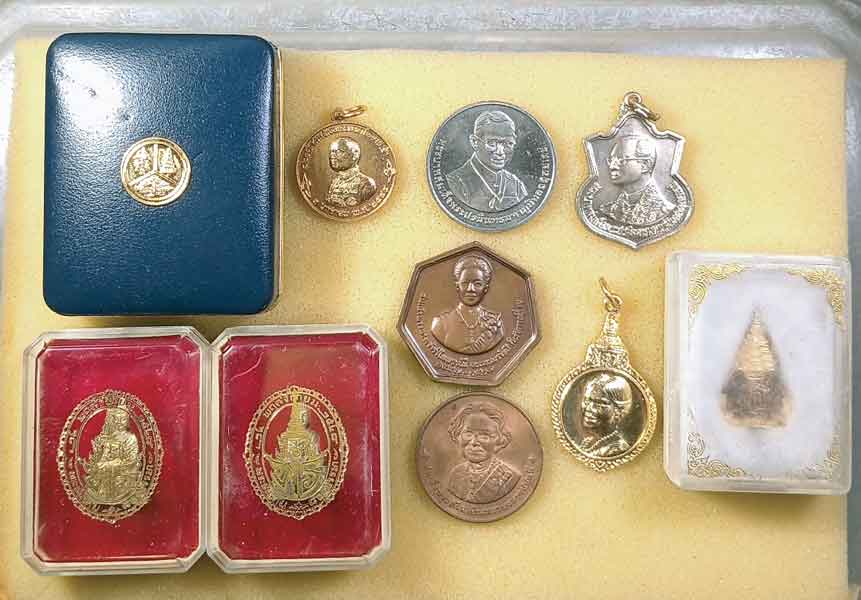 เหรียญร.6 2 เหรียญ + เหรียญร.9 2 เหรียญ +พระพุทธระลึกเจ้าฟ้าเพชรรัตน์ (พร.)80 พรรษา ปี 48 2องค์+สมเด็จพระนางเจ้ารำไพพรรณี +สมเด็จย่า+เหรียญ+เข็มกลัด พระนางเจ้าสิริกิต