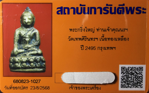 พระกริ่งใหญ่ ท่านเจ้าคุณนรฯ วัดเทพศิรินทร์ เนื้อทองเหลือง ปี 2495 กรุงเทพฯ พร้อมบัตรรับรองการันตีพระ |