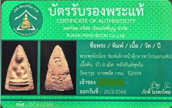 พระพุทโธน้อย พิมพ์เล็กหน้าตุ๊กตา (ตาโปนอกแฟบ) หลังยันต์พุทโธ แม่ชีบุญเรือน วัดอาวุธฯ ปี 2494 จ.กรุงเทพฯ สภาพสวยมาก คมชัดหน้าตาและยันต์ติดชัดเจนครับพร้อมเลี่ยมทอง 80% + บัตรรับรองพระแท้จาก 2 สมาคมครับ
