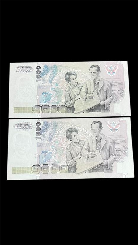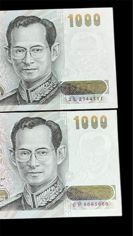 ธนบัตร 1000 บาท แบบ 14 (จัมโบ้) เลข 3 E 2744111 กับ 6 F 8695666 ลายน้ำในหลวง สภาพไม่ผ่านใช้ สวย