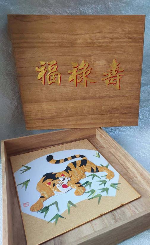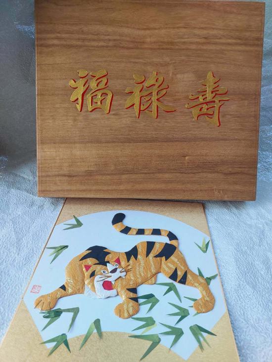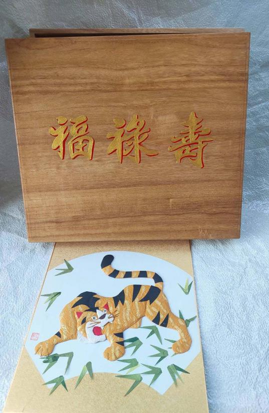***วัดใจ***กล่องไม้เก่า พร้อมตัวอักษรจีน ฮก ลก ซิ่ว กับงานศิลปะประดิษฐ์รูปเสือทำจากกระดาษ เป็นของสะสม