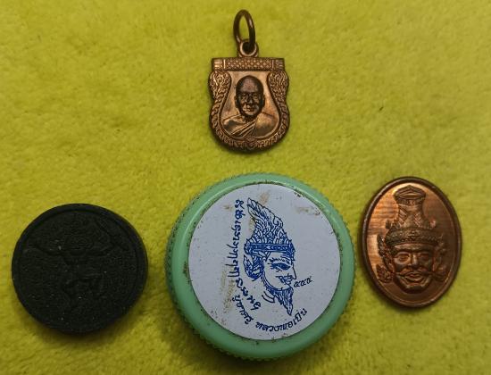 เหรียญเสมาเล็กหลวงพ่อเปิ่น วัดบางพระปี 2541+สีผึ้งบูชาครูปี 2555+ดำดื้อหลังหนุมาณถือถุงเงิน+เหรียญพ่อแก่ฤาษี ไหว้ครู ปี 2562(เคาะเดียวครับ) |