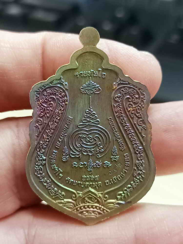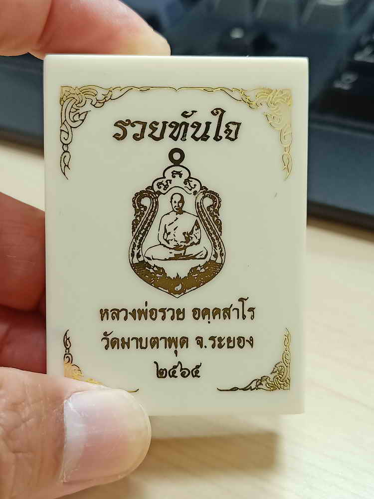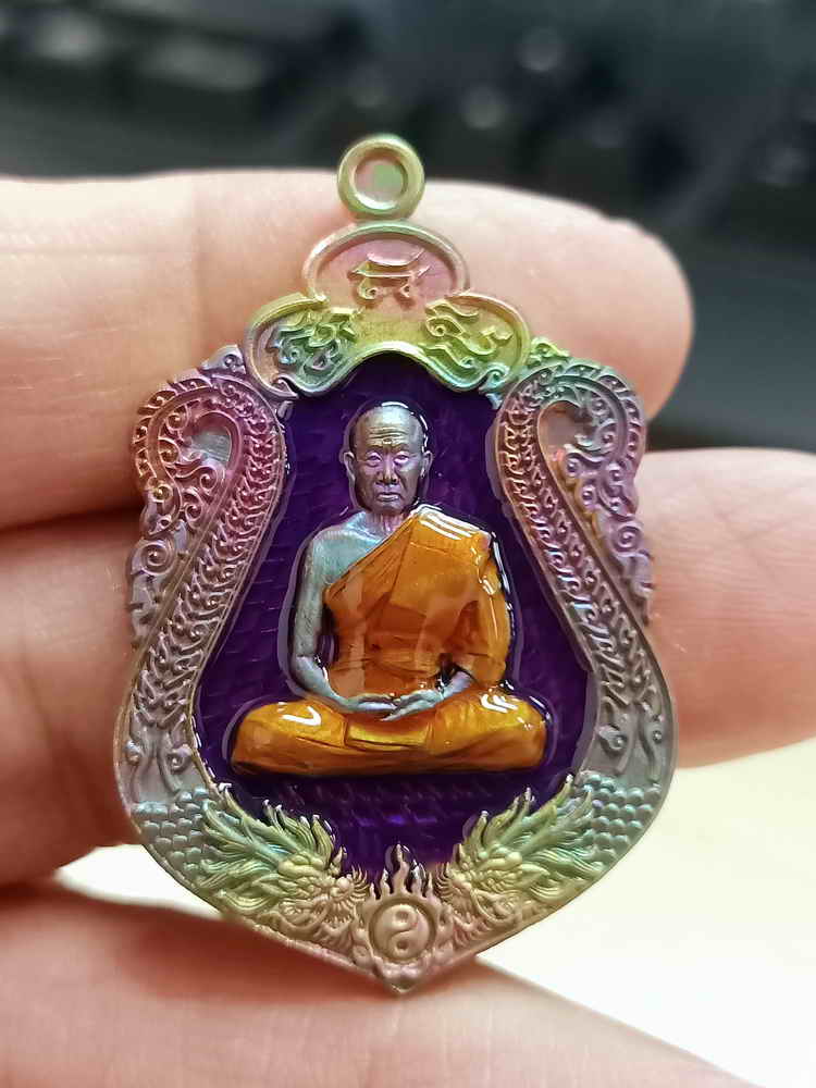 วัดใจ 100 เหรียญเสมารวยทันใจ หลวงพ่อรวย วัดมาบตาพุด จ.ระยอง ปี 2565 ชนวนผิวรุ้ง ลงยาม่วง หมายเลข 142 กล่องเดิม