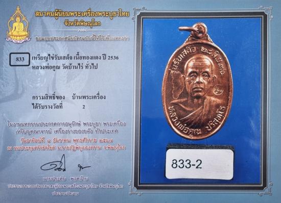 เหรียญหลวงพ่อคูณ วัดบ้านไร่ รุ่นรับเสด็จ บล็อก อ.แตก เนื้อทองแดงผิวไฟ ปี 2536 พร้อมใบประกาศ ติดรางวัลที่ 2 งานจังหวัดจังหวัดพิษณุโลก (งานสมาคมฯ)